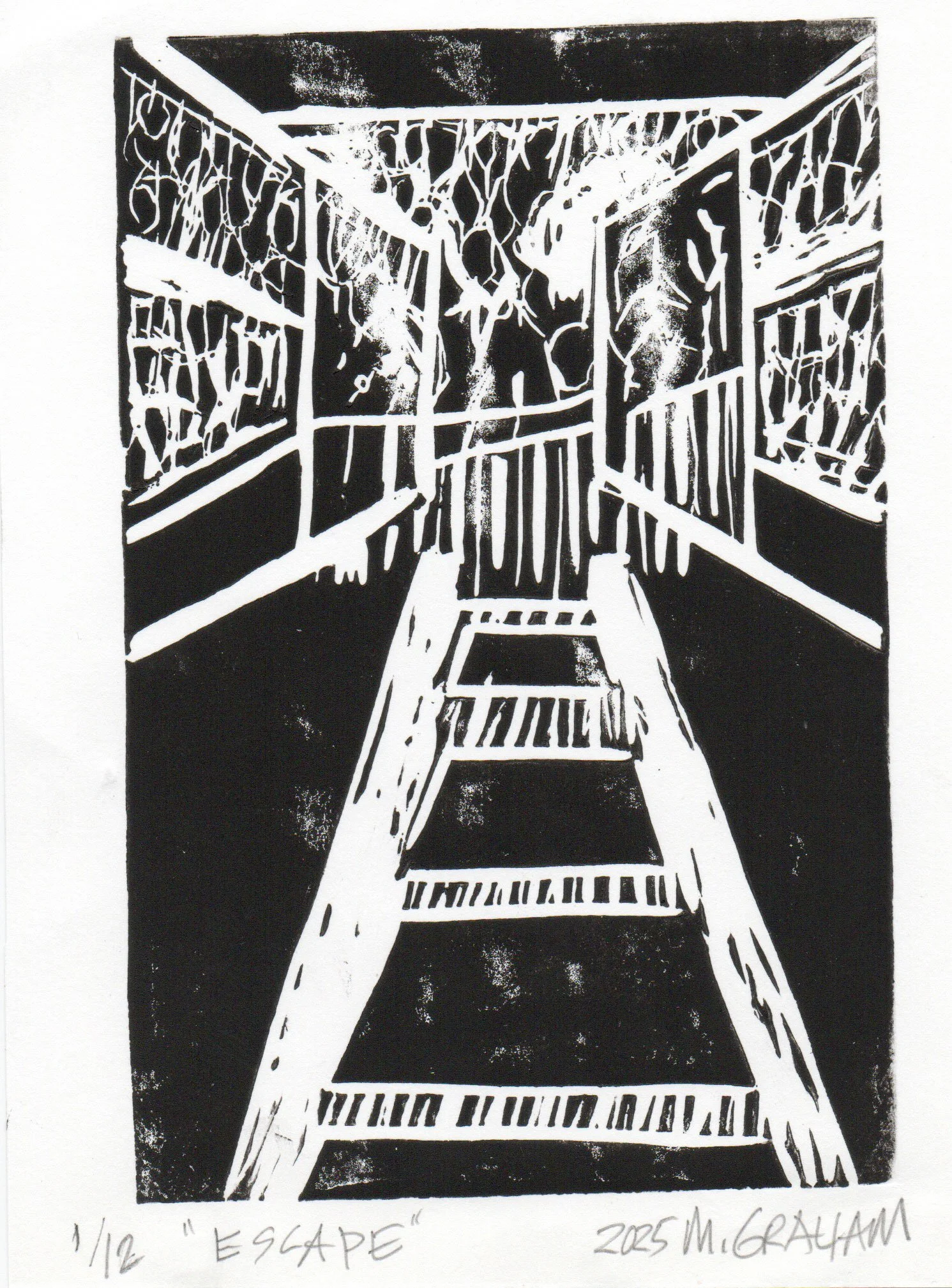 For my print, I decided to use the theme of ‘escape’ to allow myself the chance to make a print that’s different from my usual work/themes. Since graduating with my MFA, I’ve felt pressure to constantly think about the next body of work I need to make. But this was a nice escape from that mindset to create something strange and nonsensical.